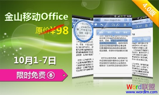 在国庆长假即将来临之际,金山WPS Office国产办公软件领头者,开始迈向移动平台,进军的第一款产品金山移动Office已经让Android用户们体验到了移动办公的快感,在预祝大家渡过愉快的七天长假之余,我们也联合金山办公为大家带来一份小礼物,就是这次金山移动Office的限时免费下载。