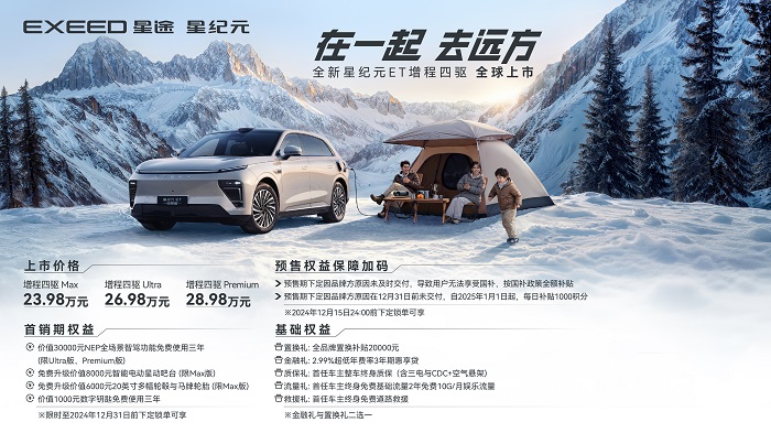 探索不止,超越向前。12月15日,奇瑞集团高端品牌EXEED星途(以下简称:星途)在北京璀璨启幕星纪元之夜,备受期待的“超能智享SUV”——全新星纪元ET增程四驱在发布会上宣布正式上市,新车共推出增程四驱Max、增程四驱Ultra、增程四驱Premium三款配置版型,官方指导价为23.98万元-28.98万元。全新星纪元ET增程四驱凭借黄金增程、雪豹四驱、猎鹰智驾三大硬核科技,以及七项全维度的科技奢享全家桶,成就“十全十美”梦想之车,为全球EXEEDer带来“超越期待、超越时代、超越豪华”的全新价值体验,塑造中国高端增程全新定义。
